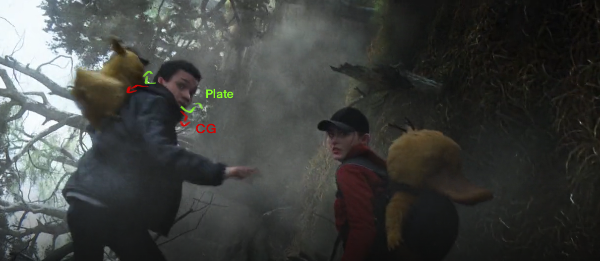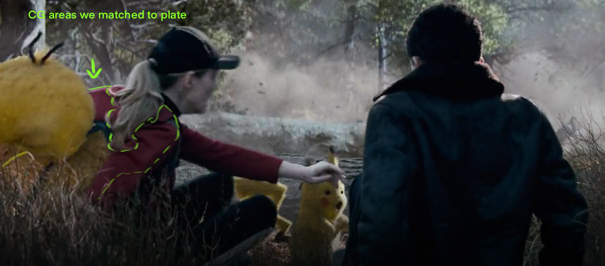 As mentioned before, we had a lot of blending CG with plate, in this case the focus was on getting Psyducks baby bjorn not only to track properly with the body, but also to cover up the real backpack Lucy was wearing on set. I used in house deformers to move geometry so it could match plate better, I’ve circulated the areas where comp used our digidoubles to transition into the plate (Lucy’s hood is CG and so are the edges of her sleeves). We also simulated the straps and parts that covered the body in order to get a more natural look.